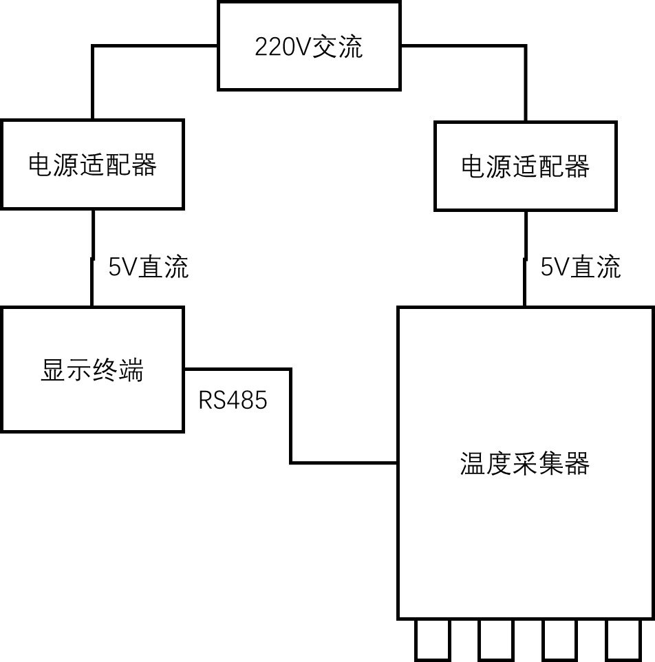 显示终端为选配件,与采集器通过RS485连接,用于轮询显示监测部位的温度信息,显示界面可根据需求部分定制